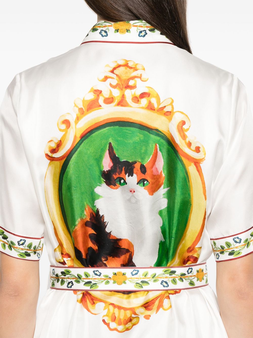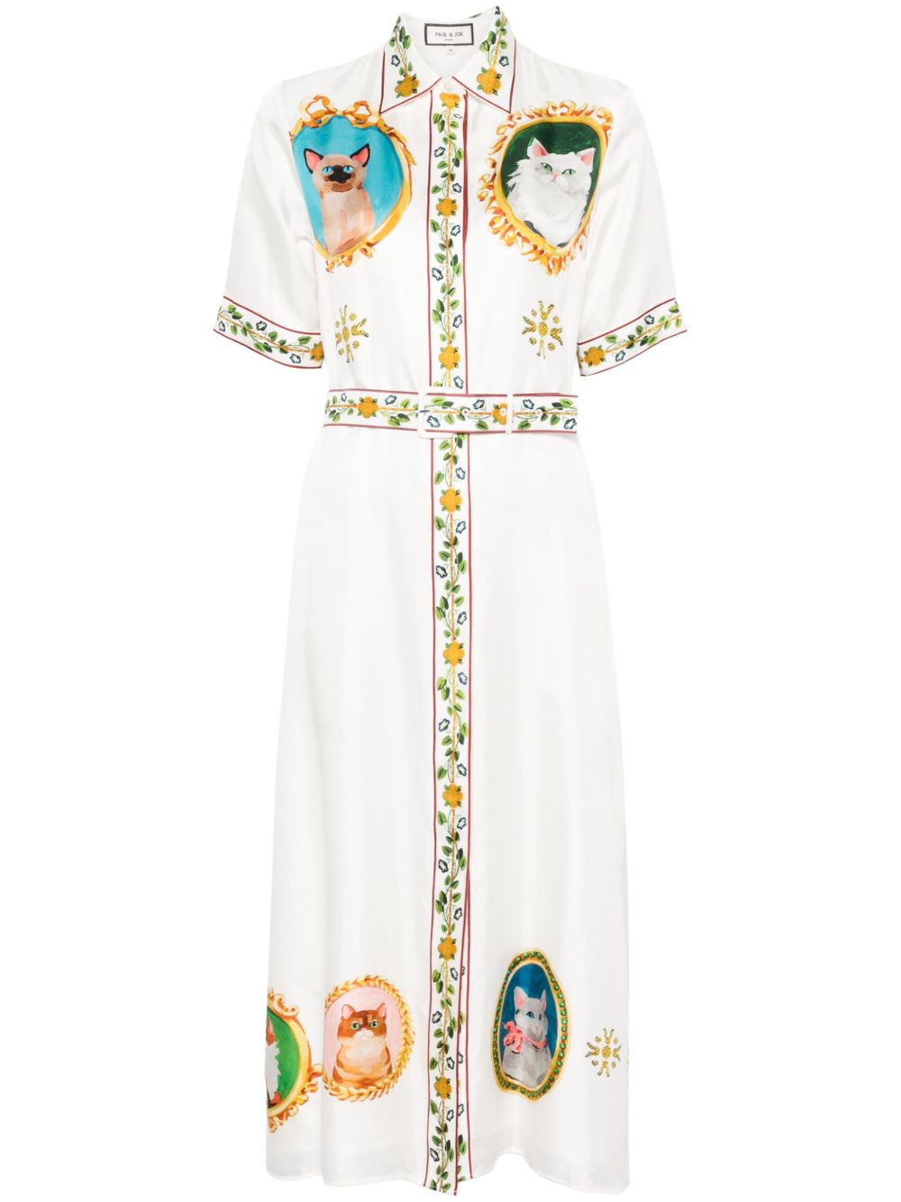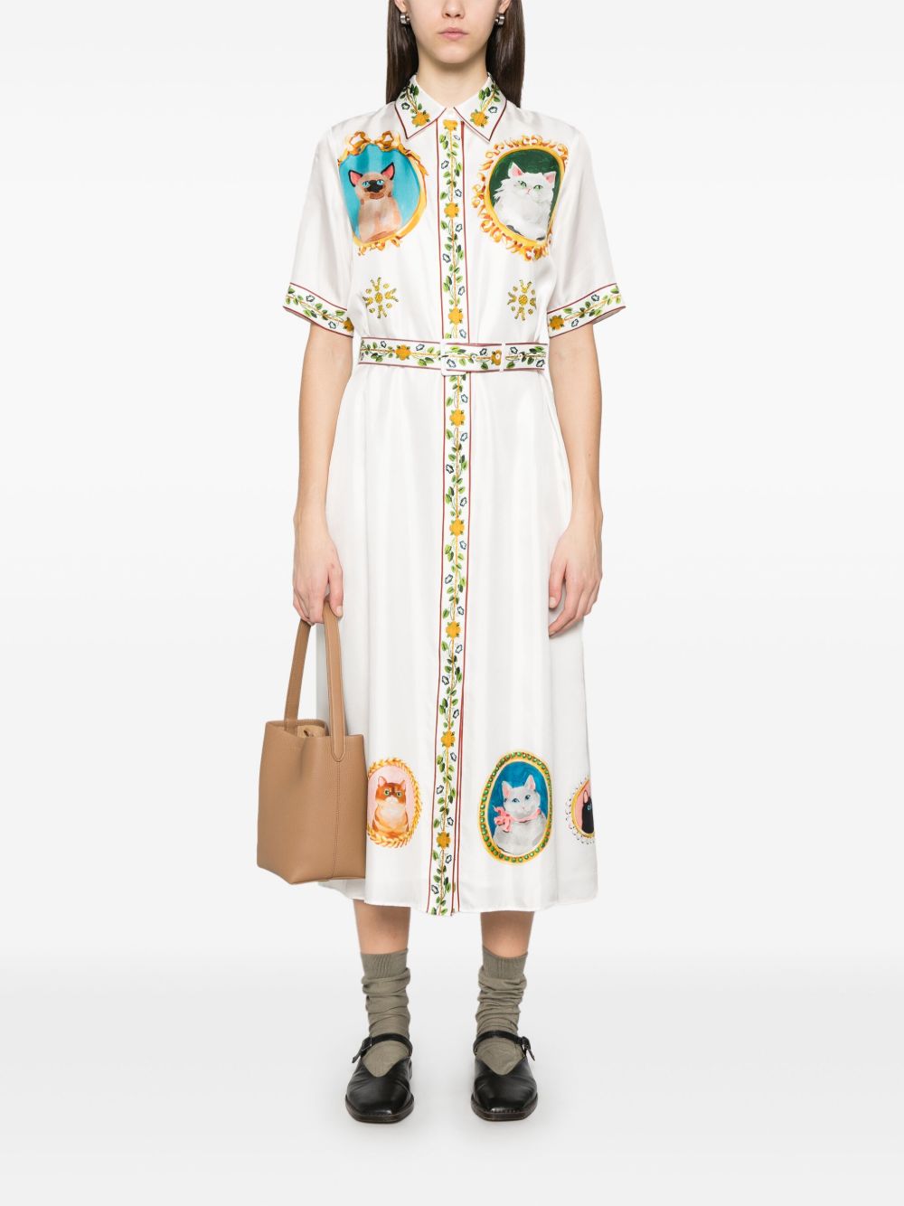 abito chemicier, manica corta, colletto a punta, chiusura con bottoni nascosta, cintura in tessuto con passanti, tasche laterali, bordi con stampa floreale, stampa con ritratti di gatti Composizione: 100% seta Istruzioni per il lavaggio: lavare a secco