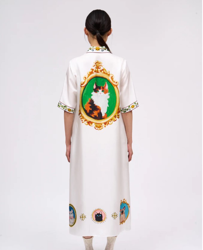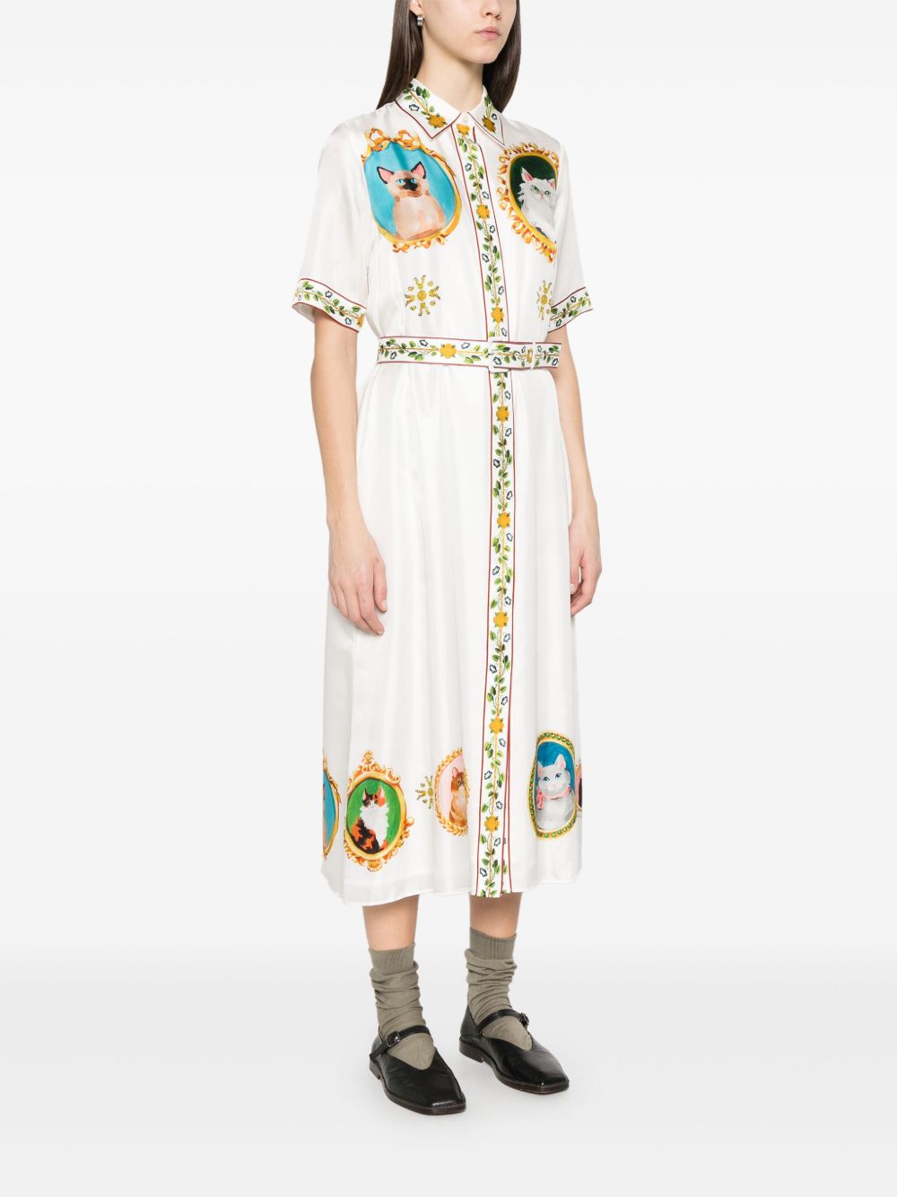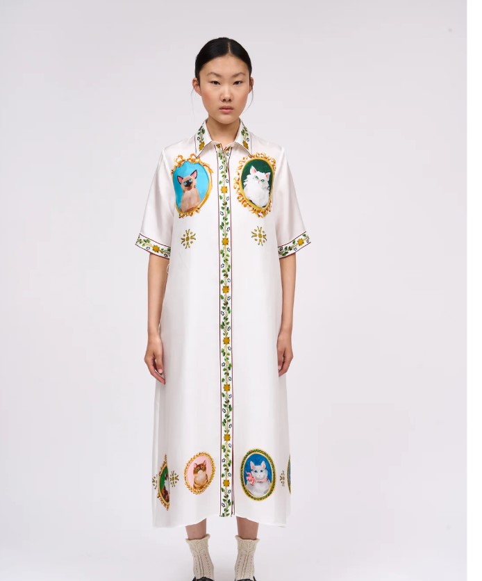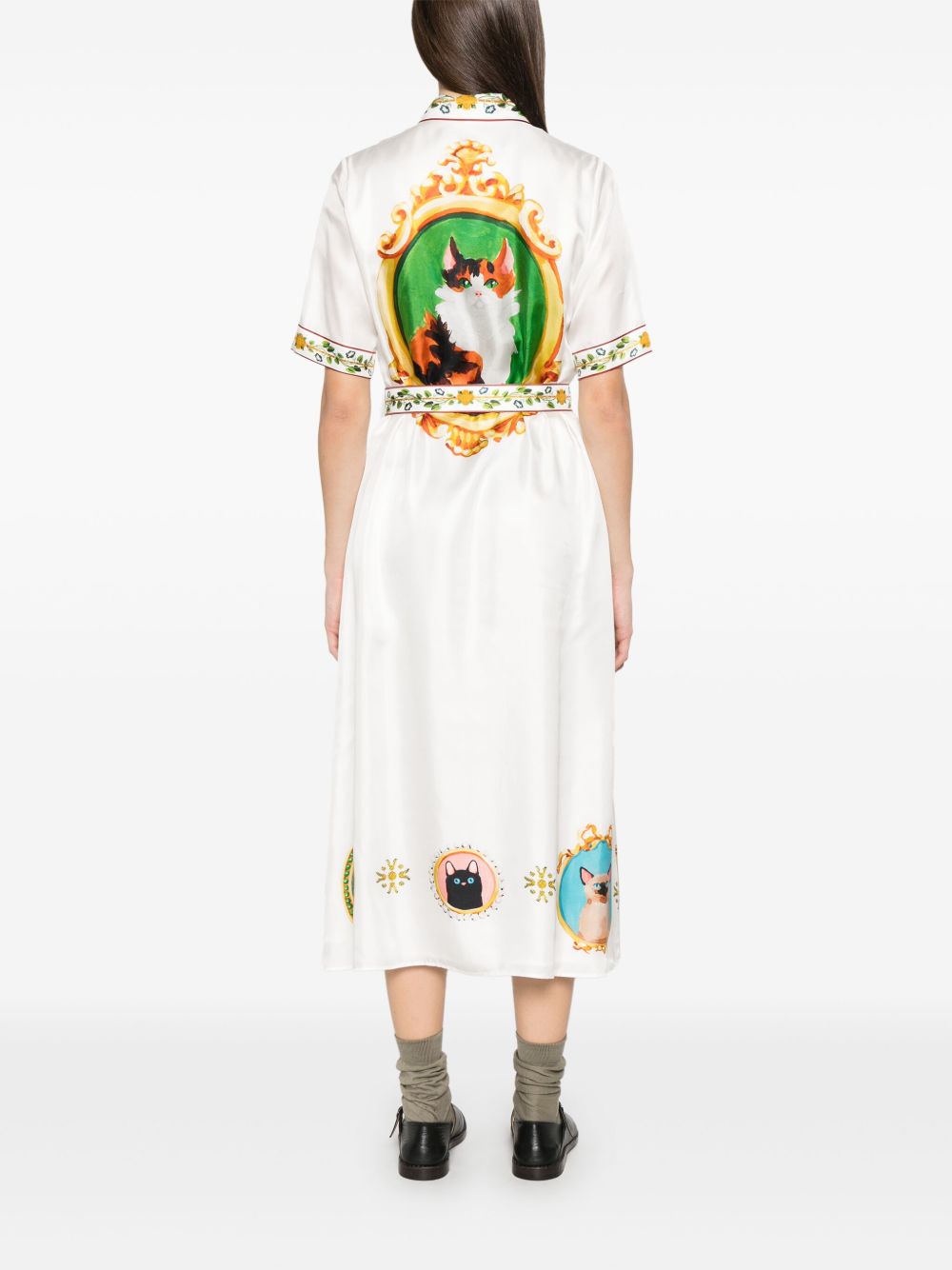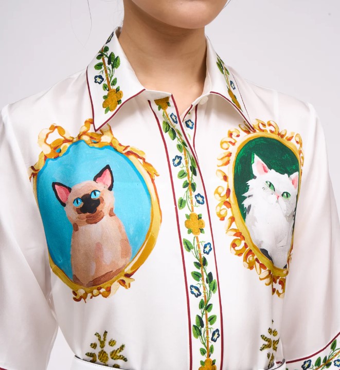 abito chemicier, manica corta, colletto a punta, chiusura con bottoni nascosta, cintura in tessuto con passanti, tasche laterali, bordi con stampa floreale, stampa con ritratti di gatti Composizione: 100% seta Istruzioni per il lavaggio: lavare a secco