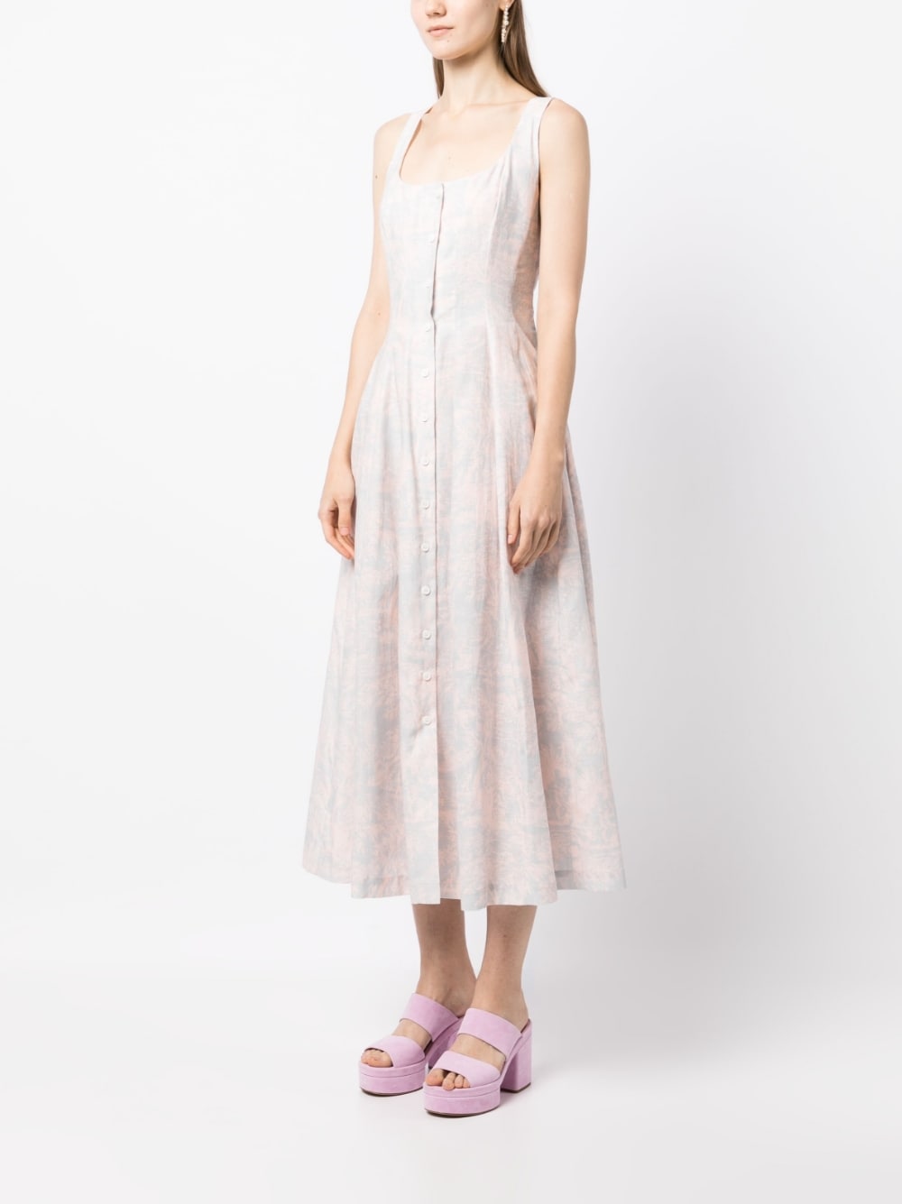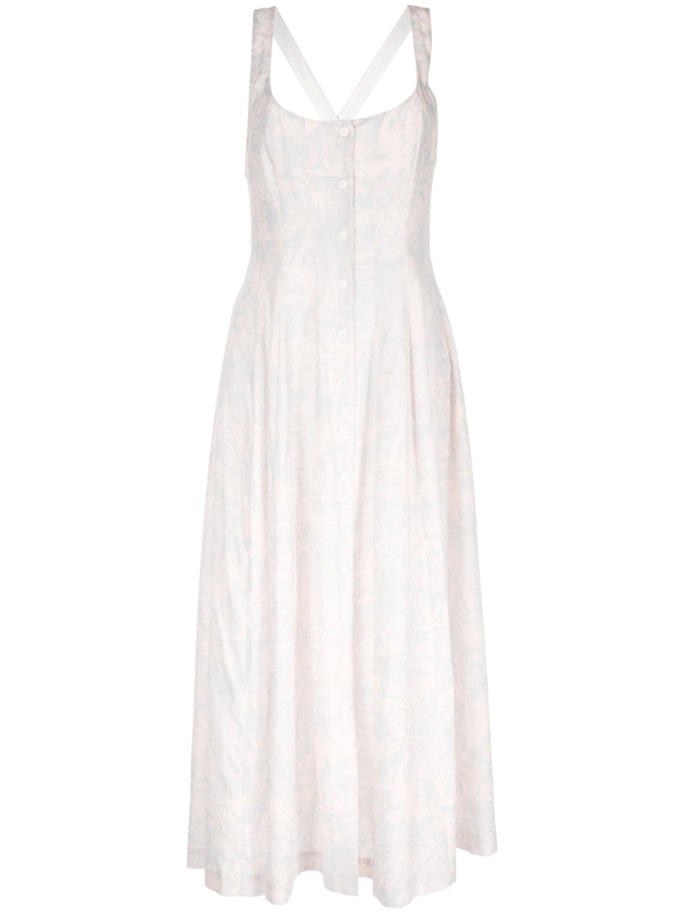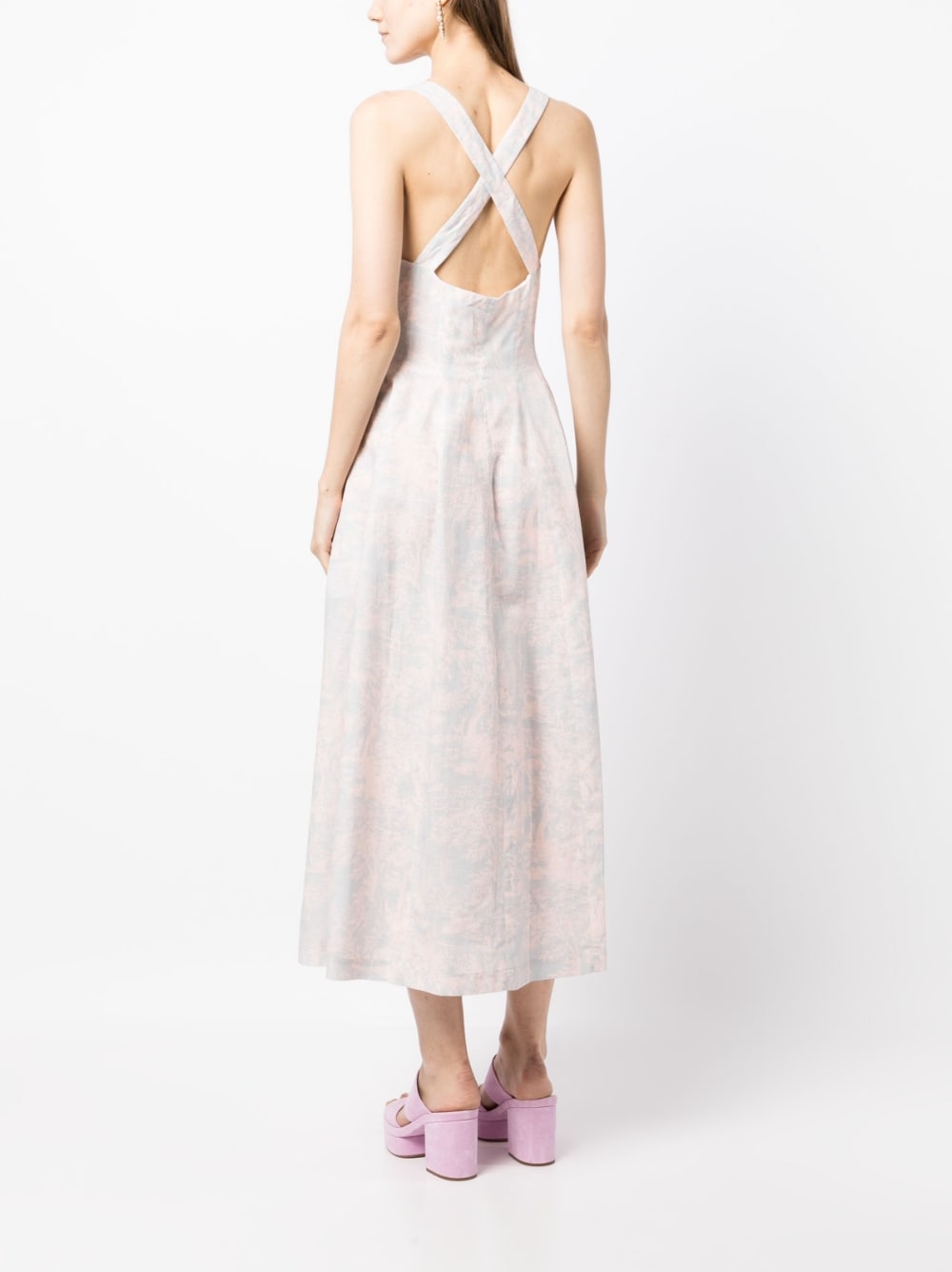 abito, tessuto con stampa toile de jouy, bretelle con incrocio posteriore, bustino con stecche, chiusura con bottoni frontali, tasche, sfoderato Composizione: 51% lino 49% cotone Istruzioni di lavaggio: lavare a mano
