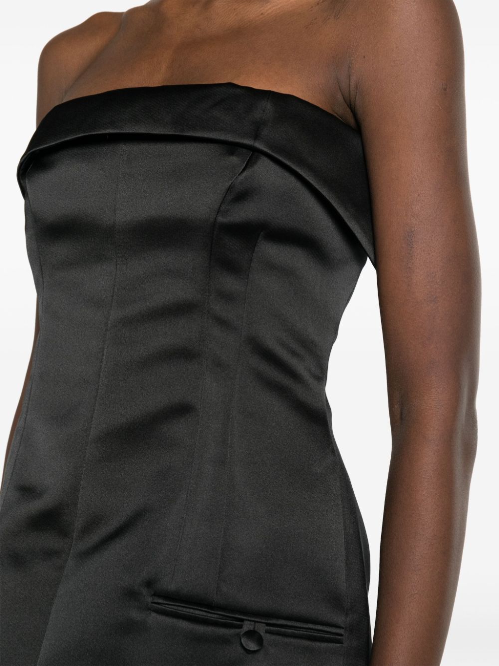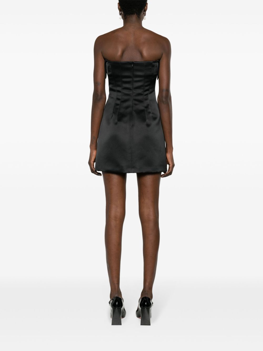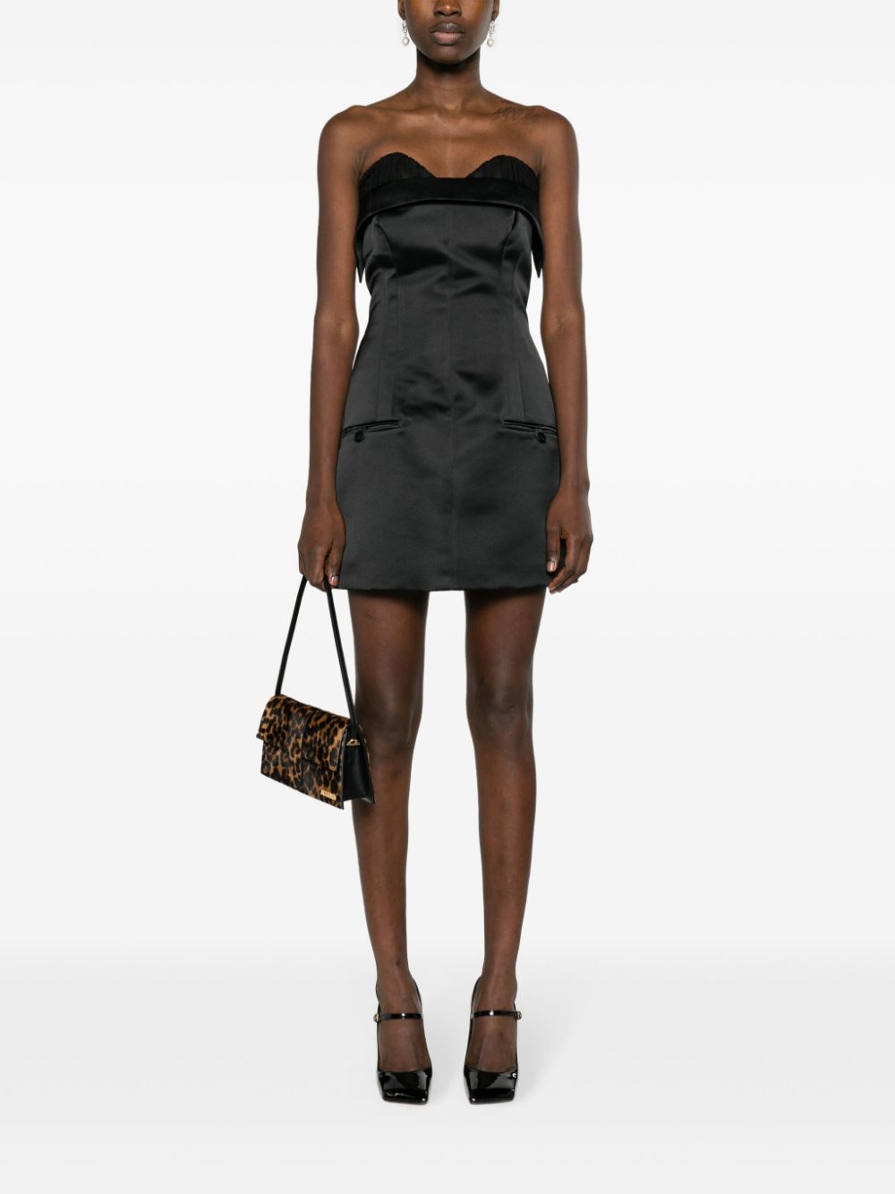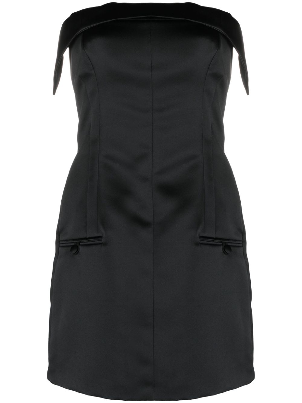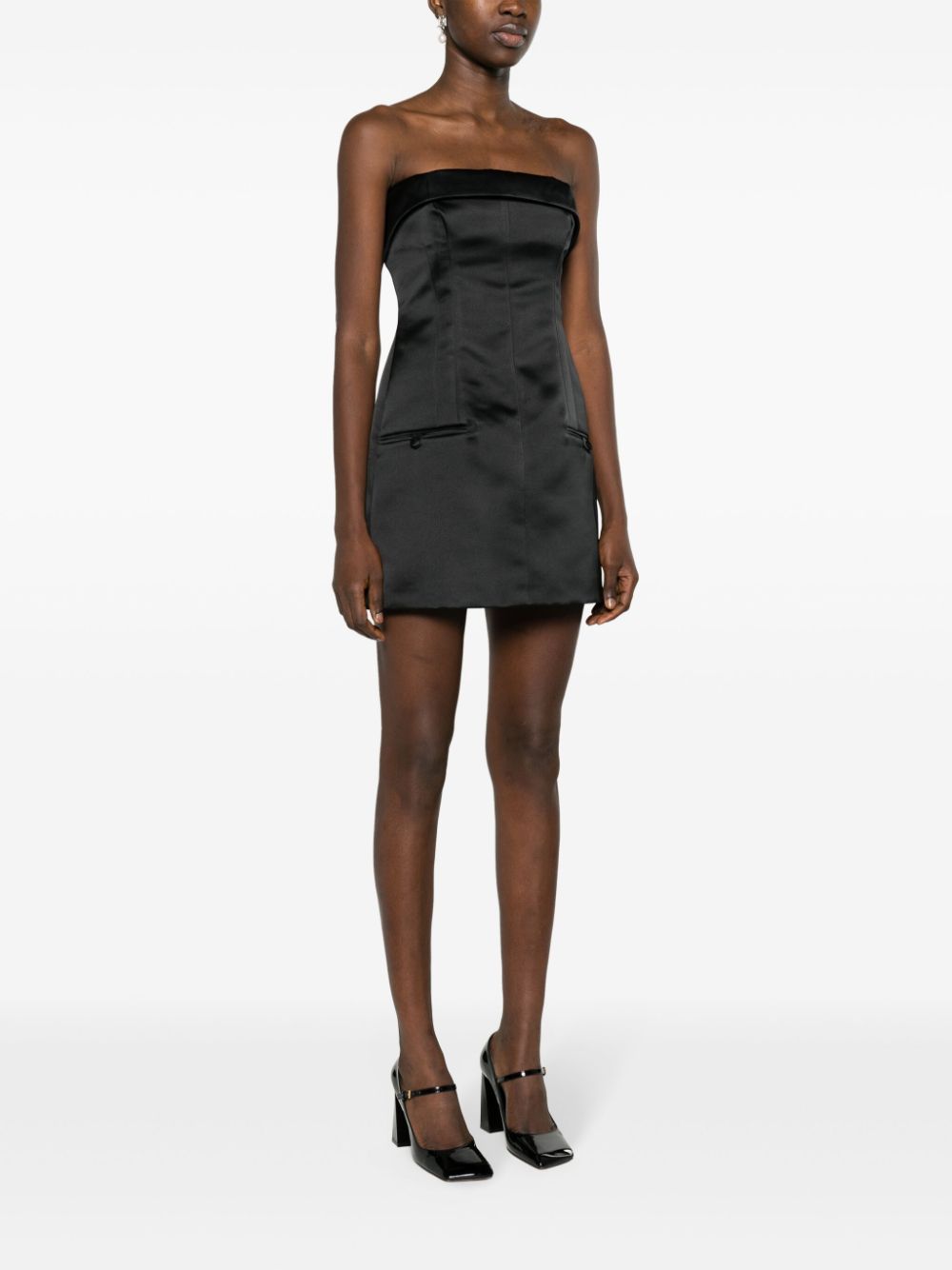 abito corto, satin, senza bretelle, corsetto con risvolto, tasche a filo con bottone , chiusura con zip, fondo svasato Composizione: 100% poliestere Istruzioni per il lavaggio: lavare a secco