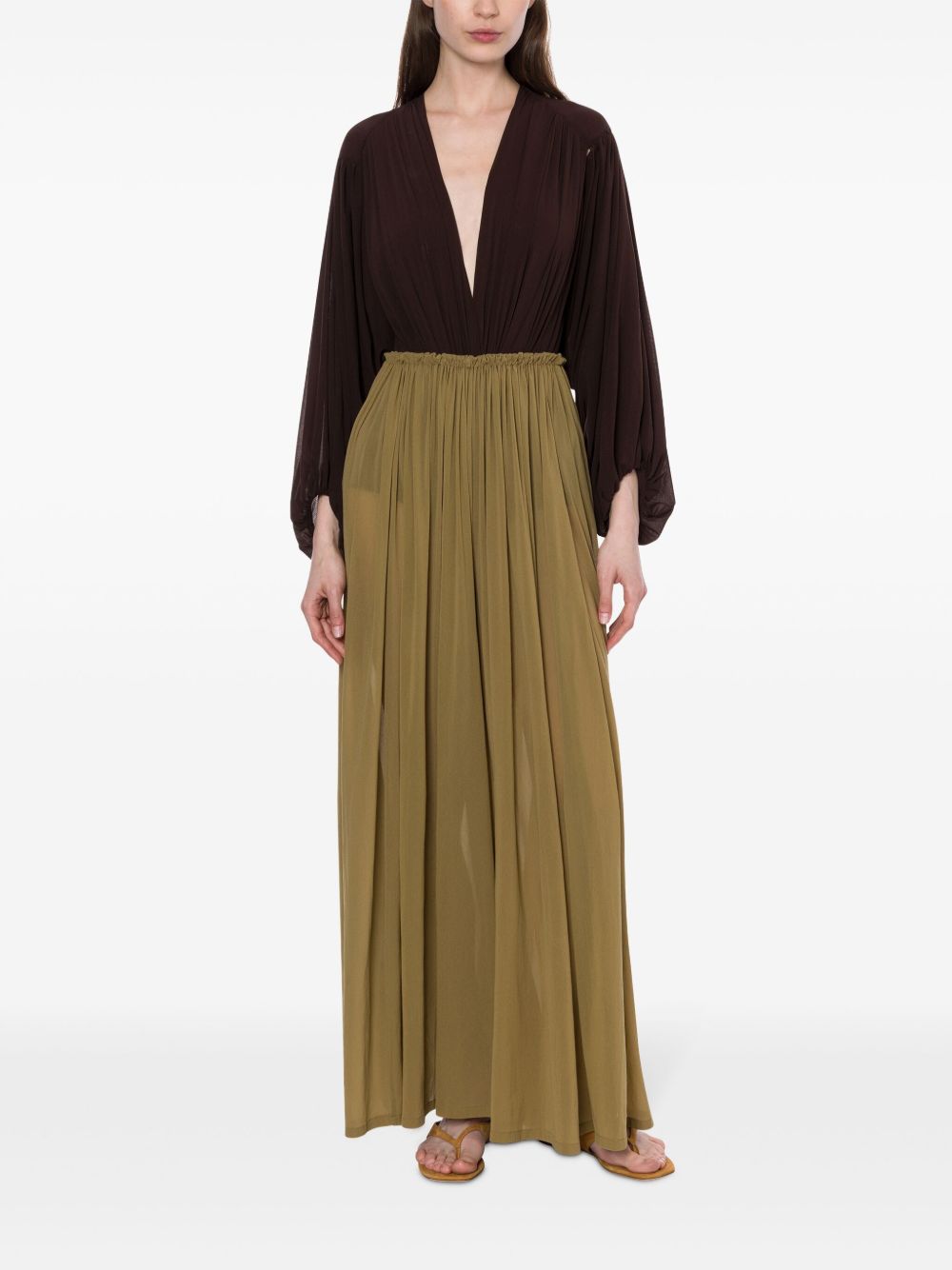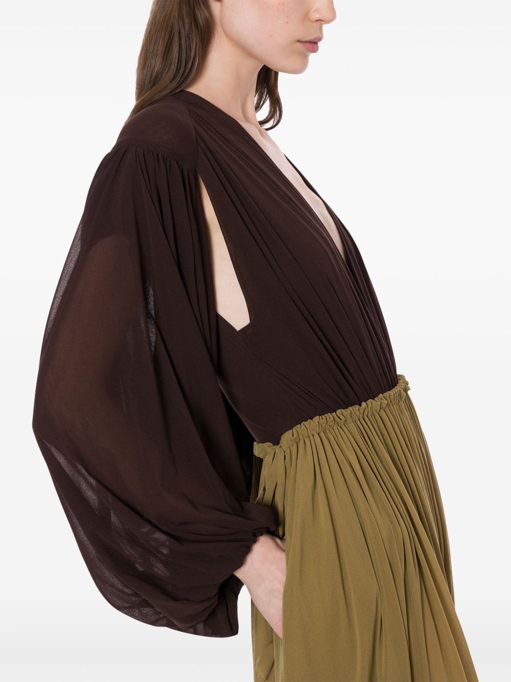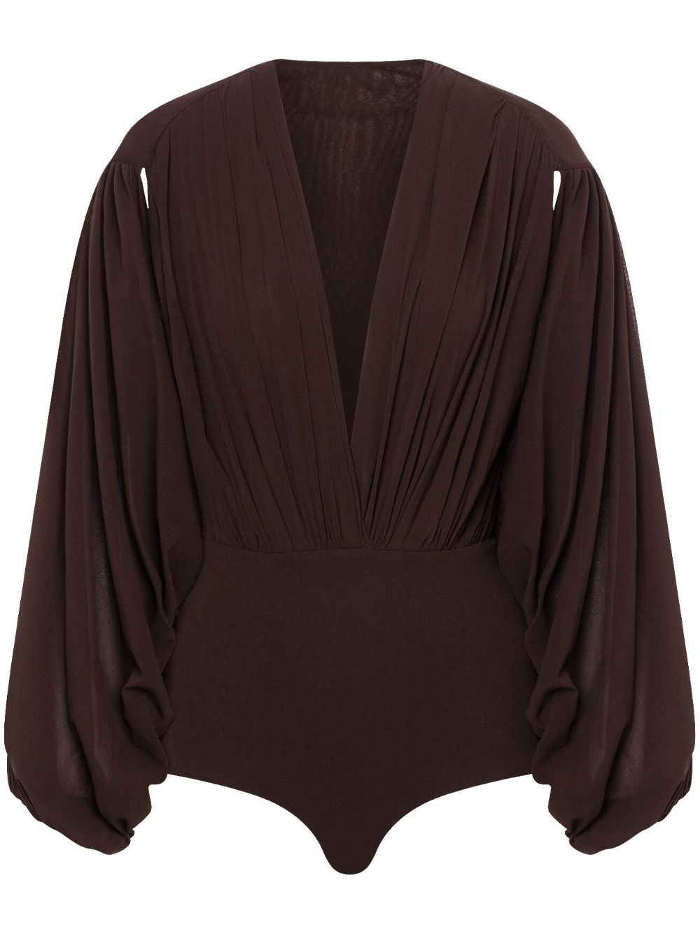 body, tulle stretch, scollo a v, spalla con drappeggio, manica lunga a sbuffo, polsi con arriccio, giro manica aperto, punto vita arricciato, chiusura con gancetti Composizione: 100% poliamide Istruzioni per il lavaggio: lavare a mano