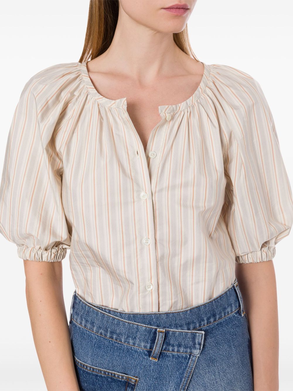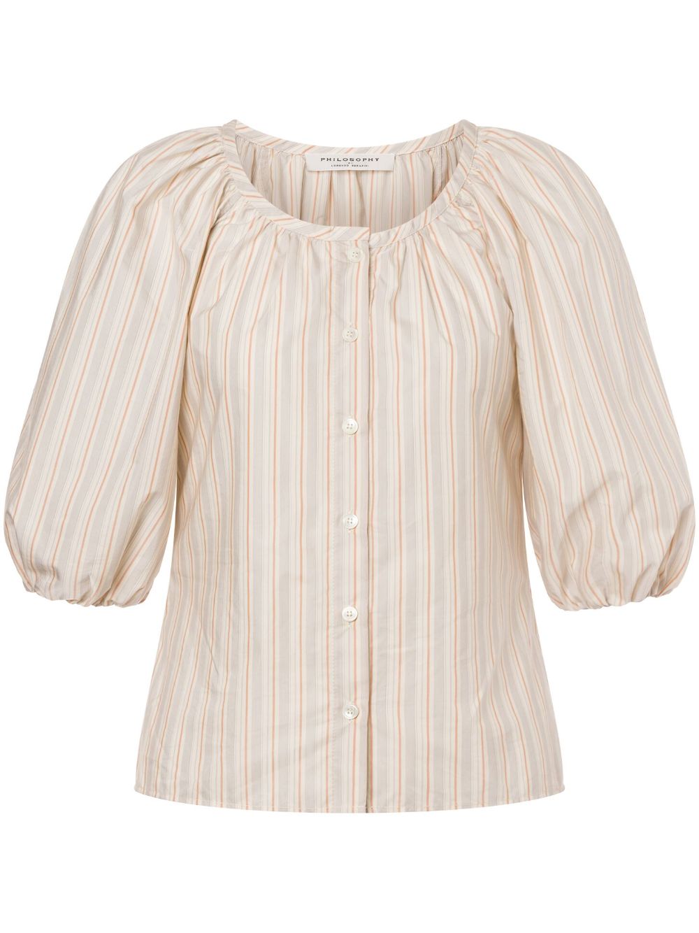 camicia, scollo a giro ampio, chiusura con bottoni, manica corta a sbuffo con fondo elasticizzato, tessuto a righe Composizine: 45% cotone, 55% poliammide Istruzioni per il lavaggio: lavare in lavatrice