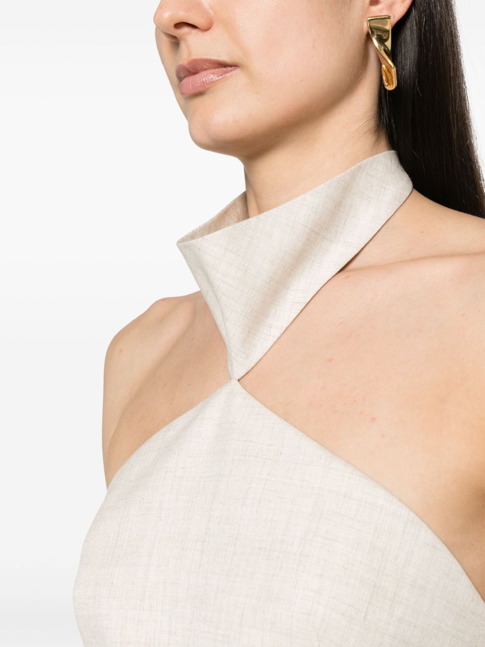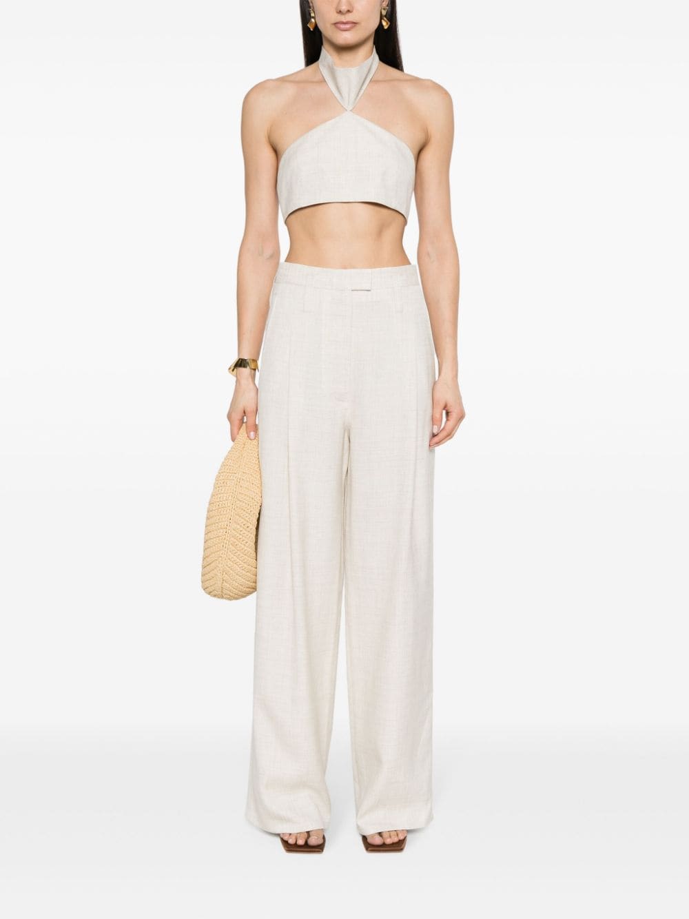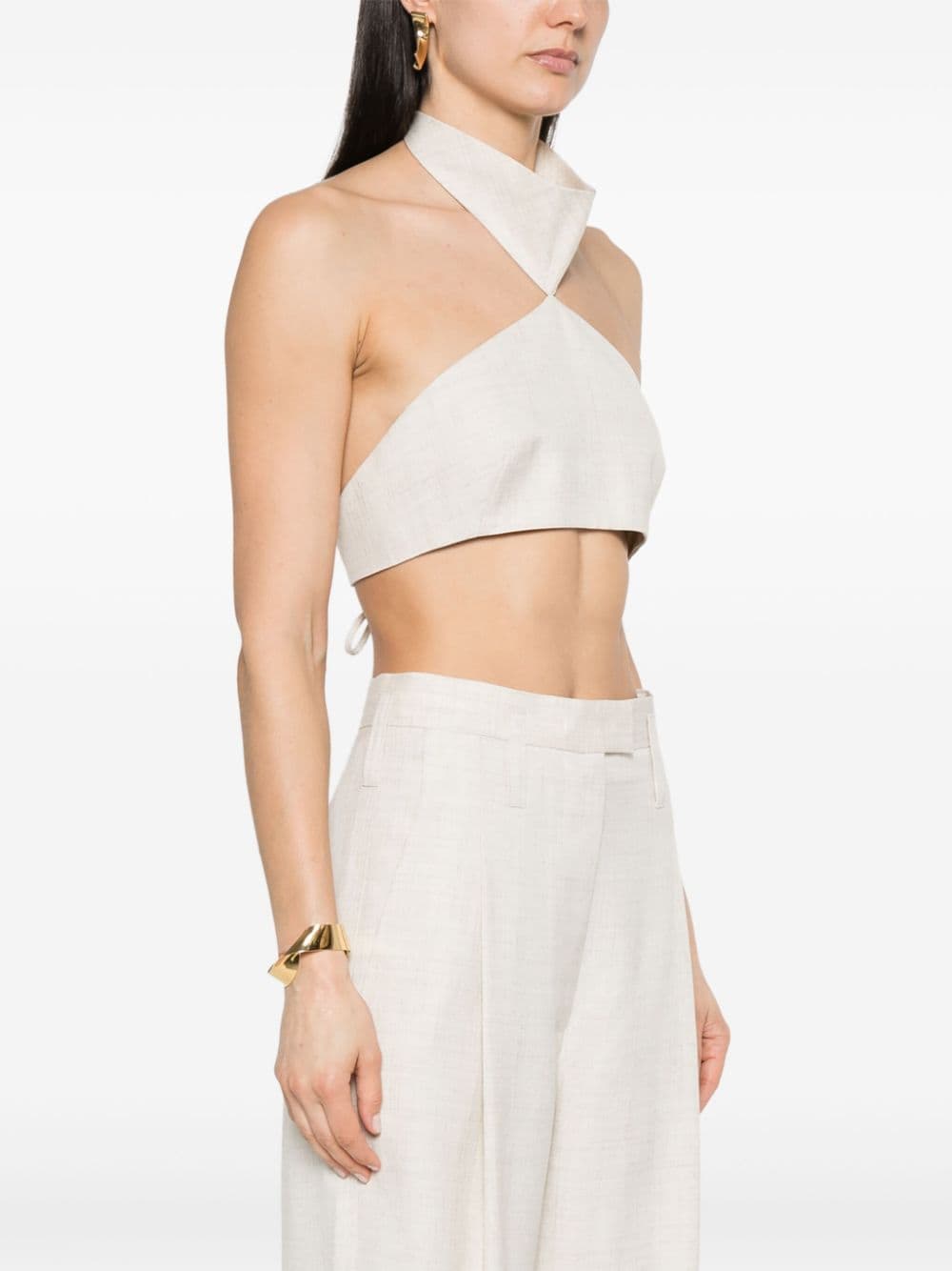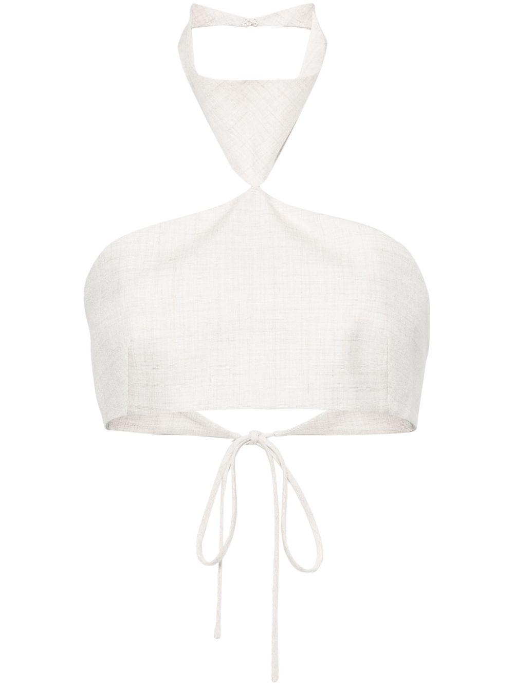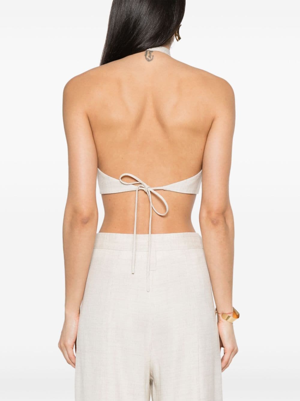 top , modello crop, collo con chiusura posteriore, schiena nuda, chiusura con nodo, ecru Composizione: 86% viscosa 14% lino Istruzioni per il lavaggio: lavare a secco