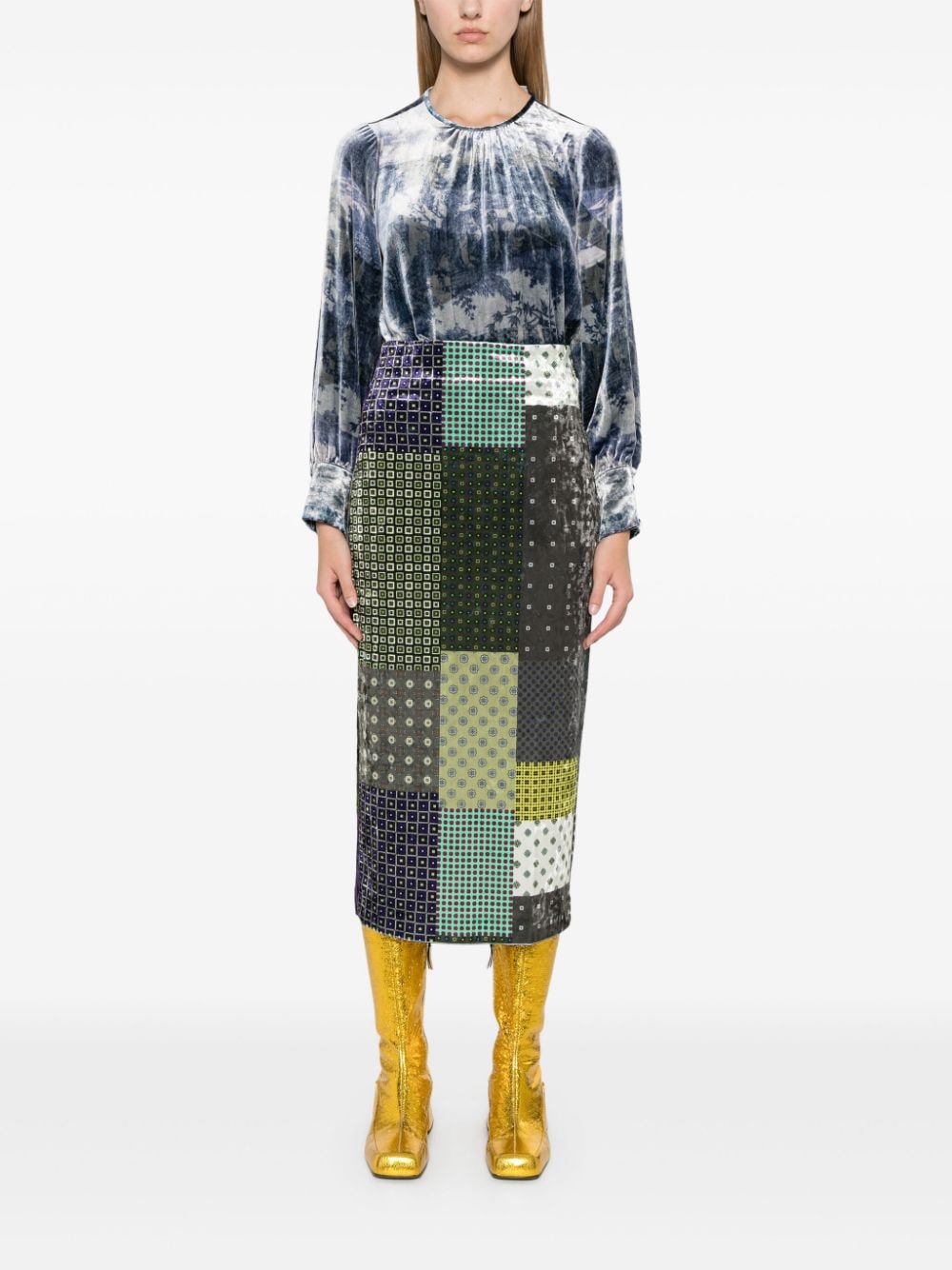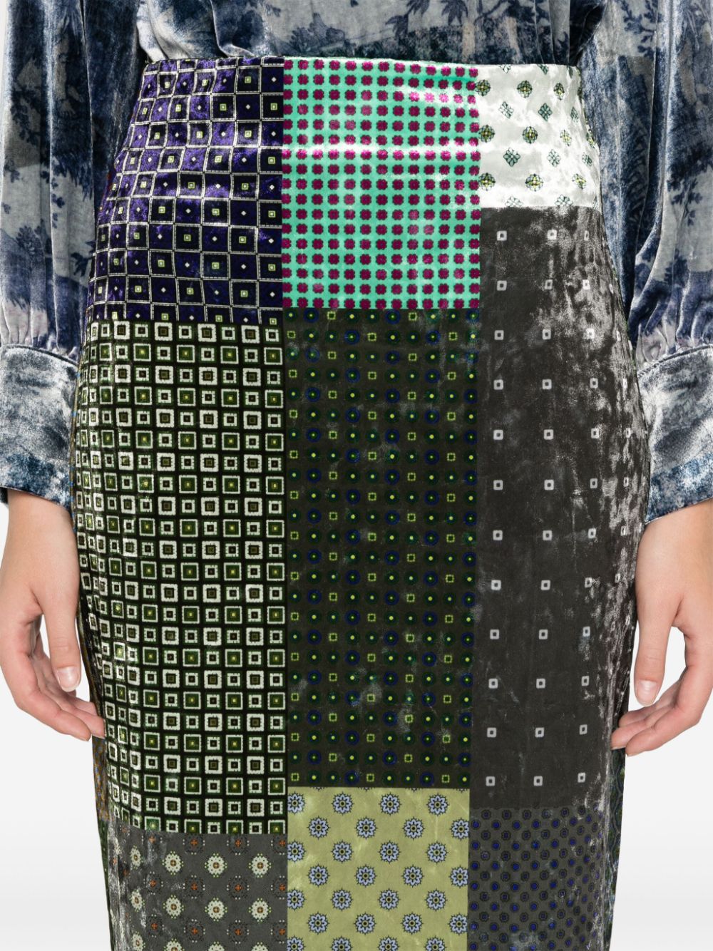 gonna a tubino, vita alta, chiusura con zip posteriore, spacco posteriore, stampa patchwork all over, velluto liscio Composizione: 92% poliestere 8% elastane Istruzioni per il lavaggio: lavare solo a secco