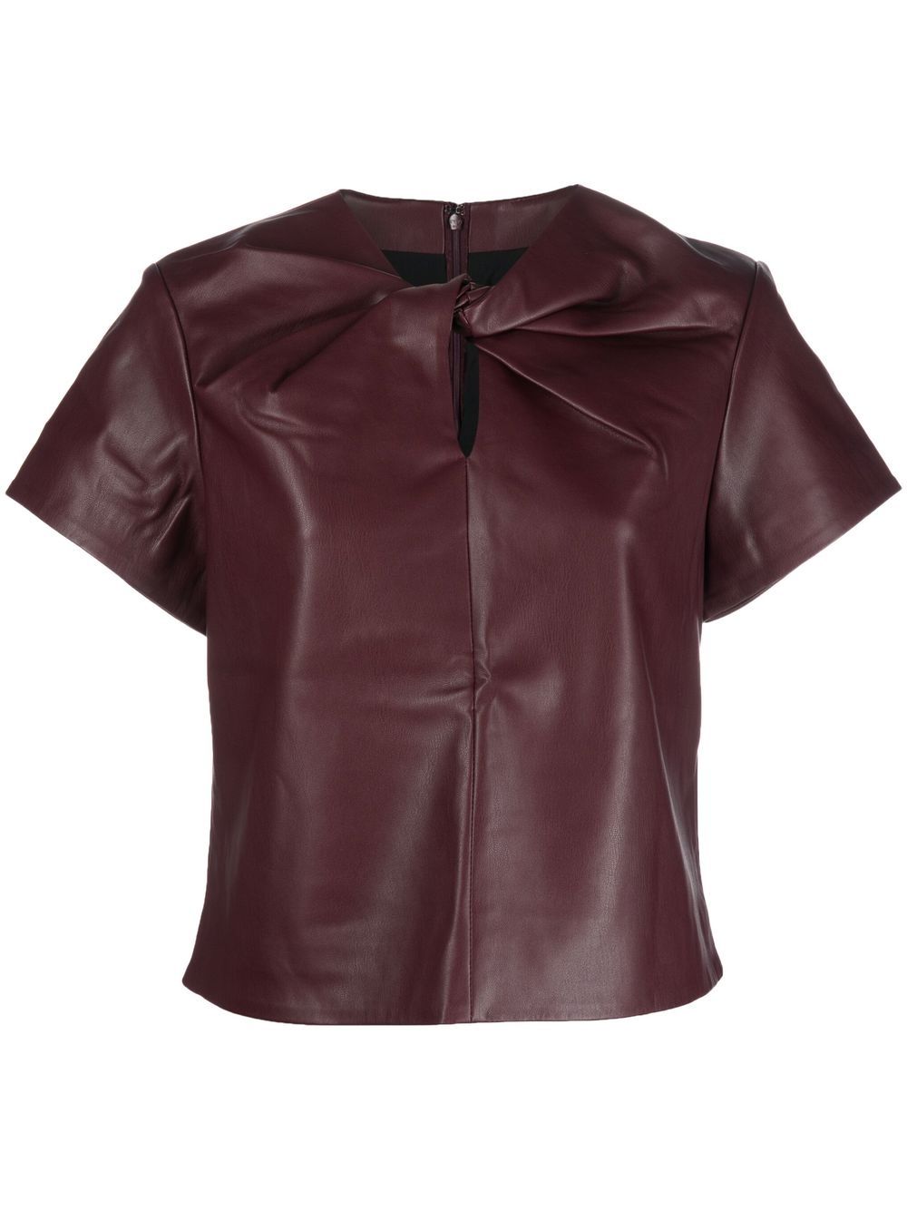 top, pelle sintetica, manica corta, girocollo con nodo, zip posteriore, foderato
