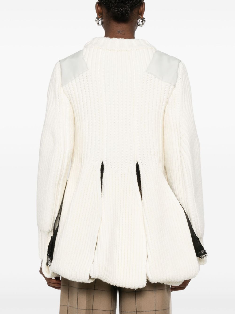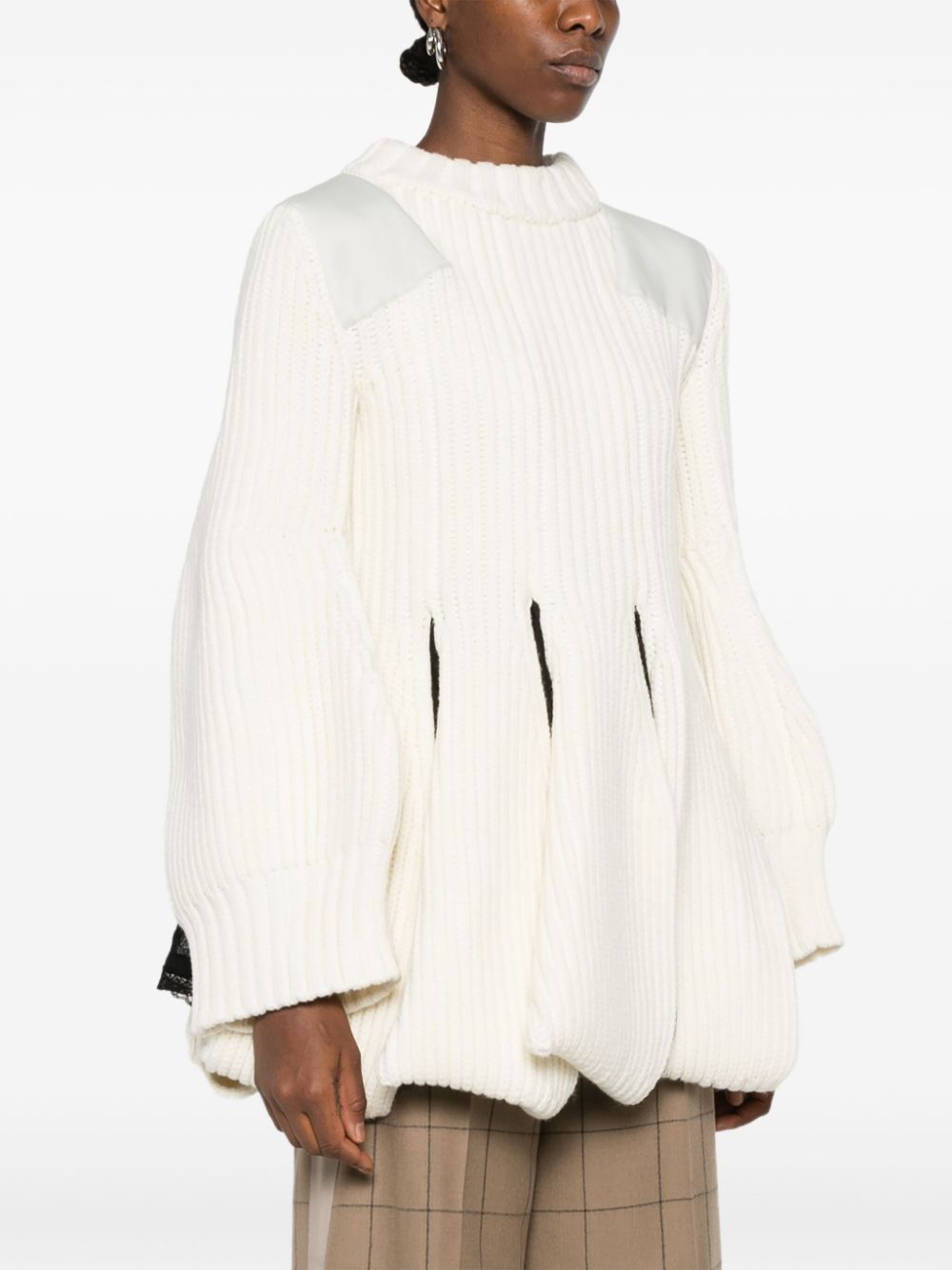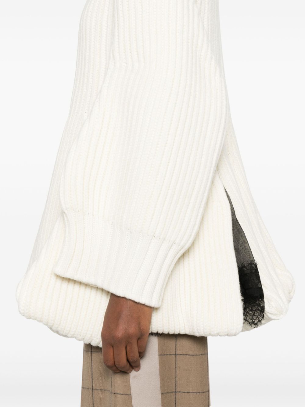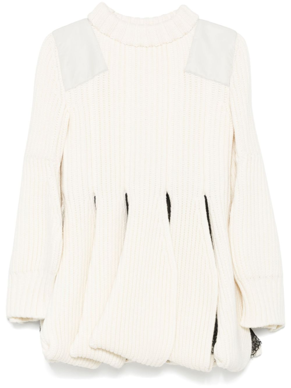abito corto, maglia a coste, girocollo, manica lunga e larga , fondo svasato con inserti di tulle e pizzo a contrasto , spalline imbottite in nylon, interno foderato in tulle