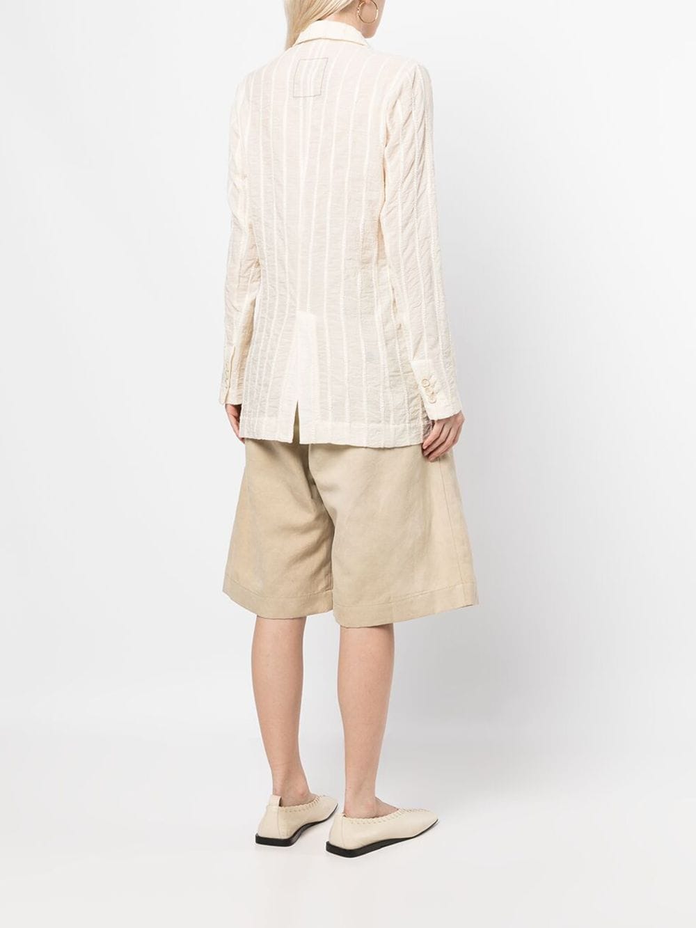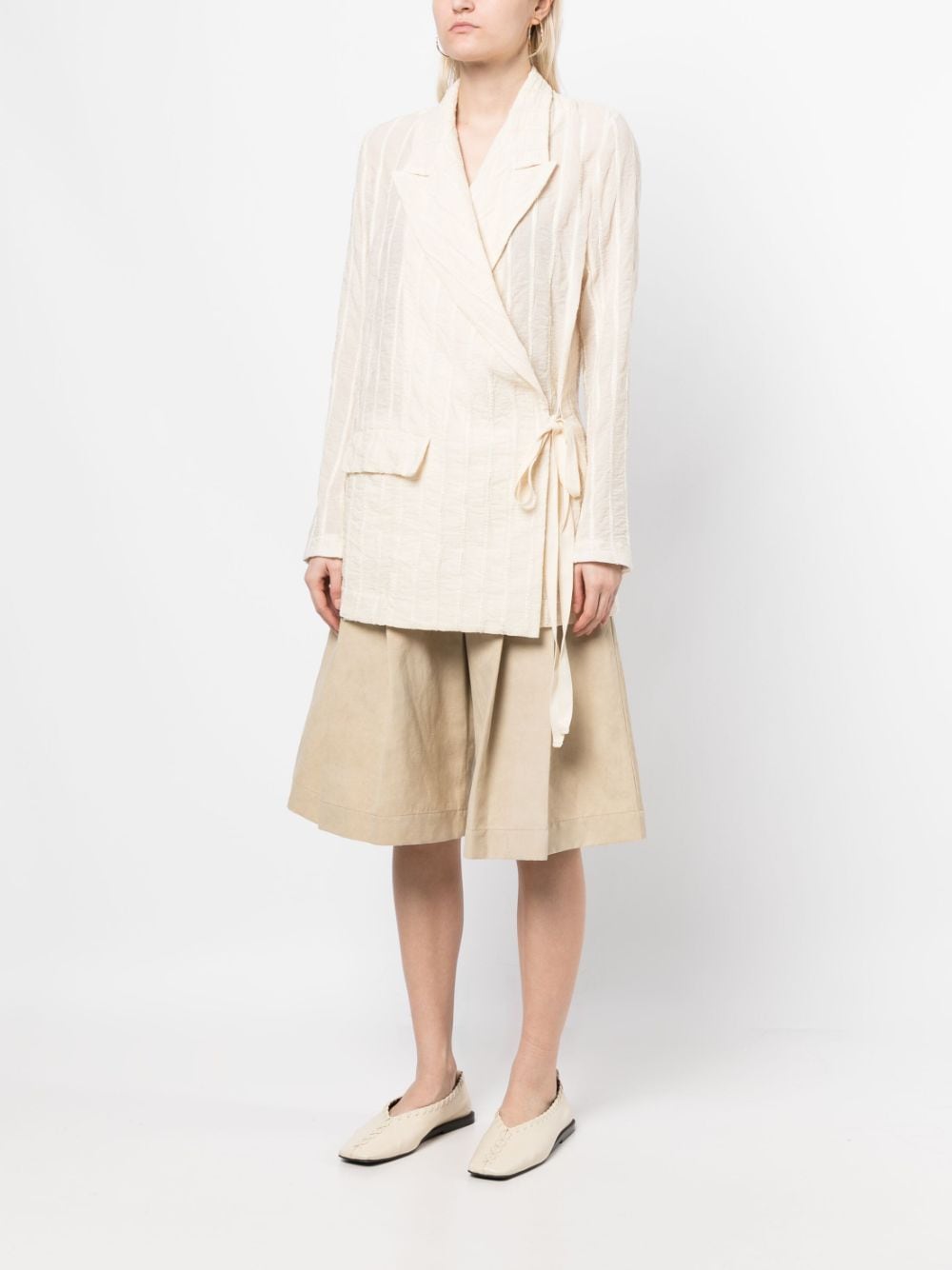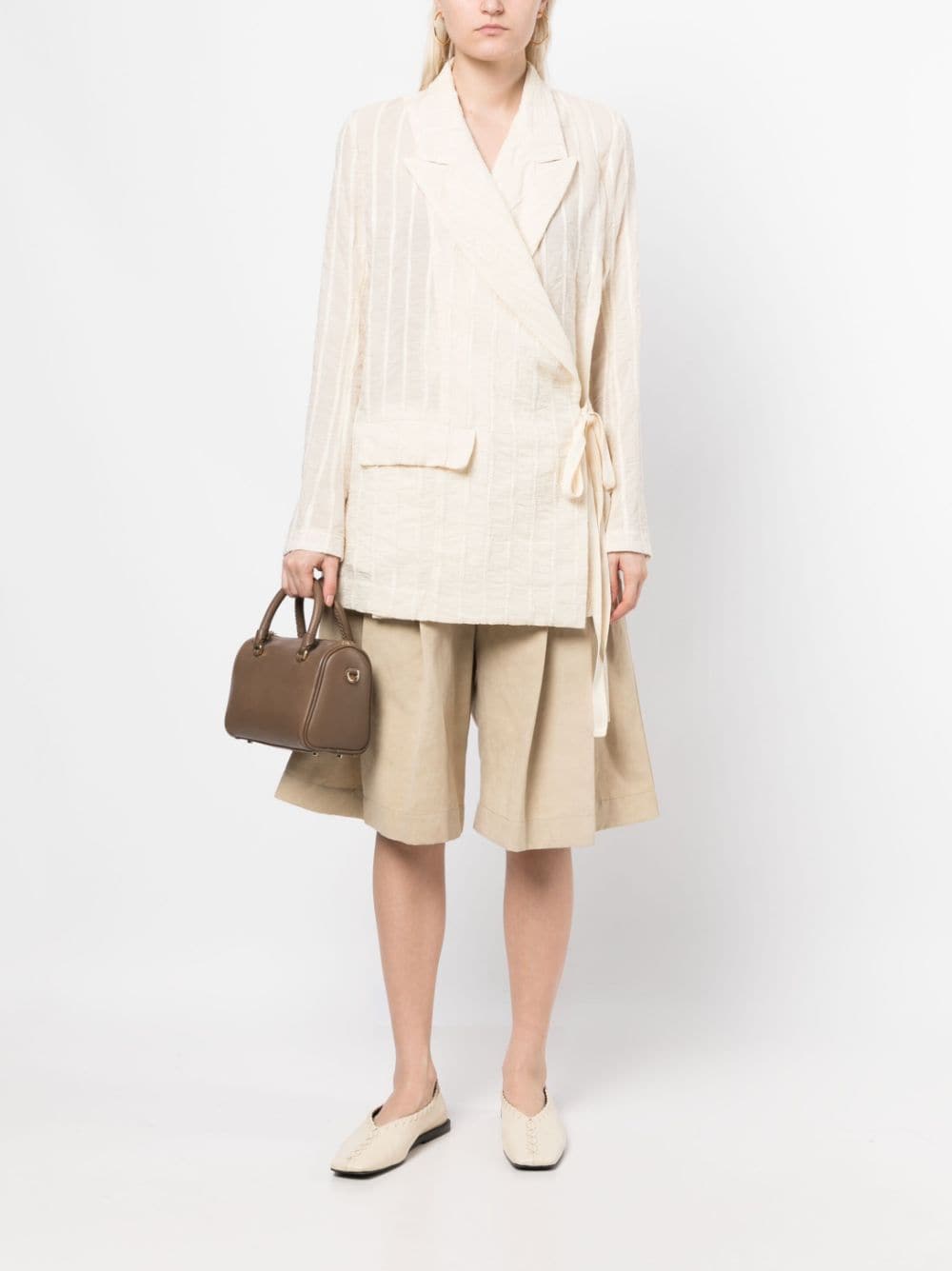 giacca, doppio petto, chiusura laterale con nodo, revers a lancia, tasca con pattina, tessuto operato a righe verticali Composizione: 100% cotone Istruzioni di lavaggio: lavare a secco