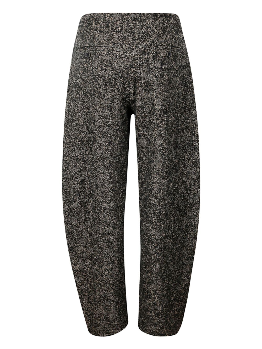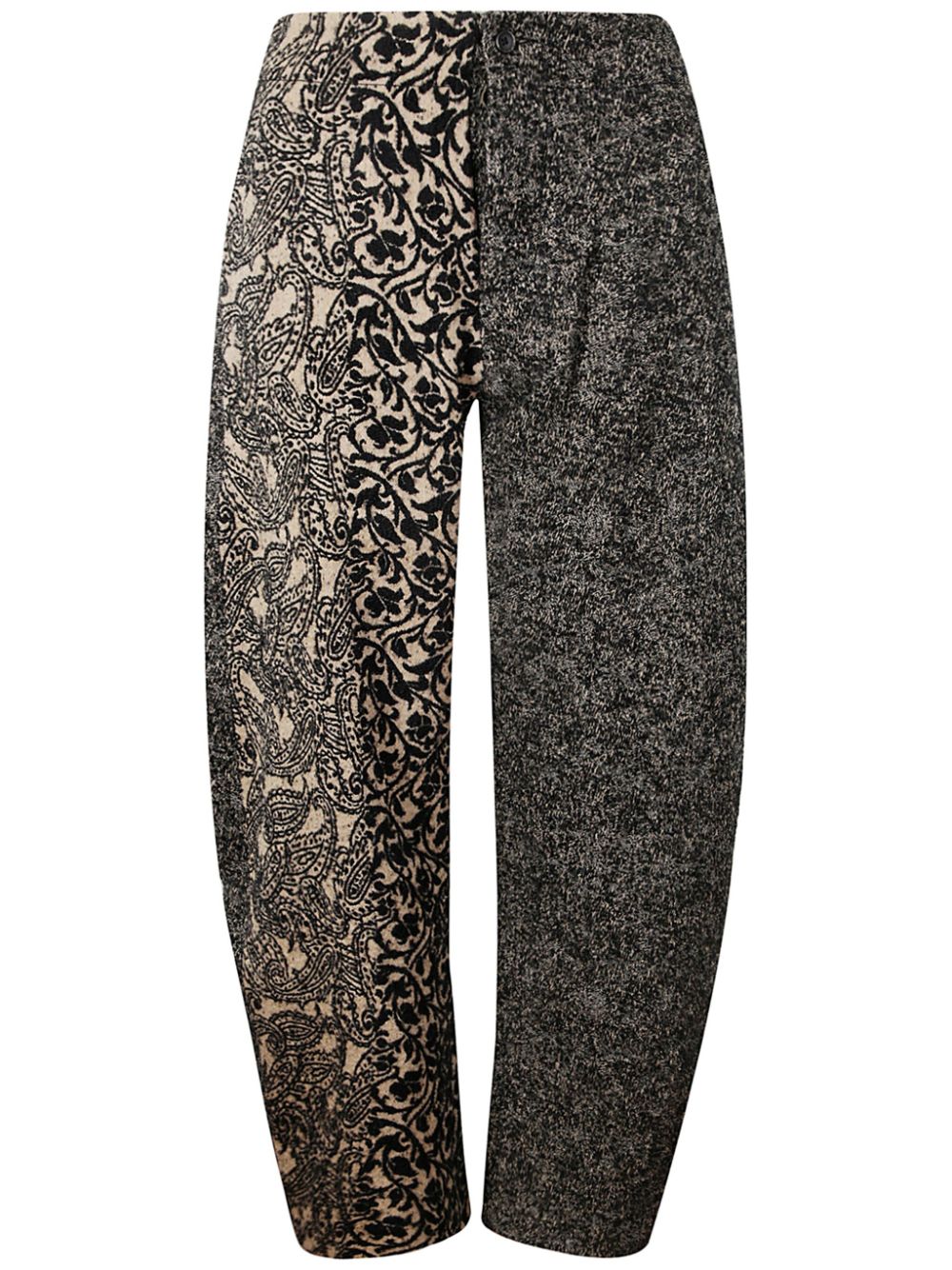 pantalone, tessuto jaquard e tessuto tweed, chiusura con bottoni, tasche laterali, tasche posteriori con bottoni, gamba larga Composizione: 76% lana vergine 9% alpaca 9% mohair 6% poliammide Istruzioni per il lavaggio: lavare a mano