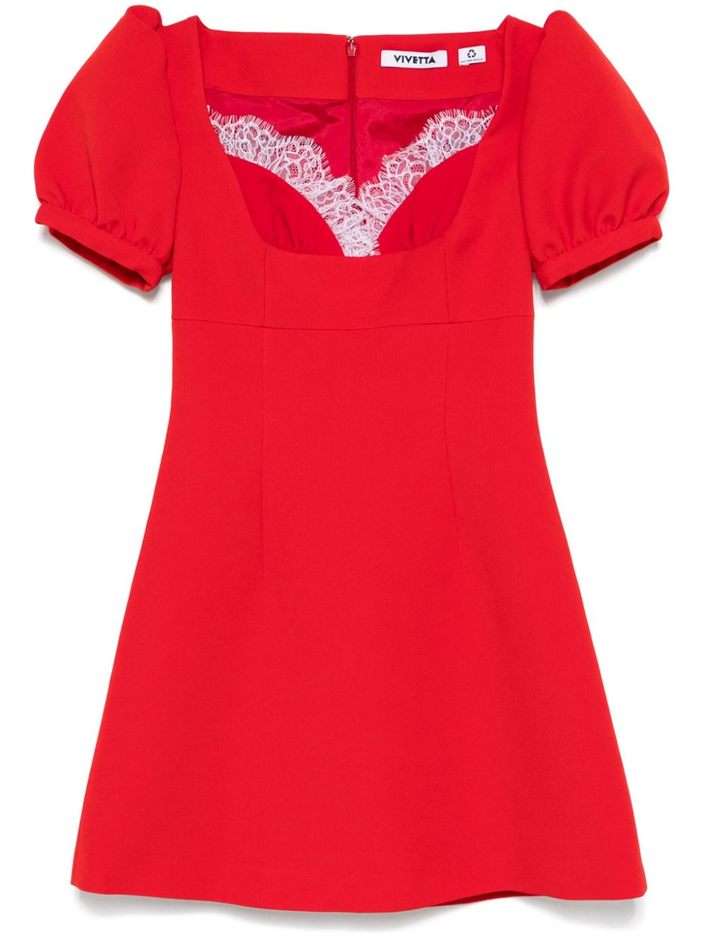 abito corto, maniche corte a sbuffo, chiusura posteriore con zip, scollo a cuore con bordo in pizzo, fondo svasato Composizione: 94% poliestere 6% elastane Istruzioni per il lavaggio: lavare a secco