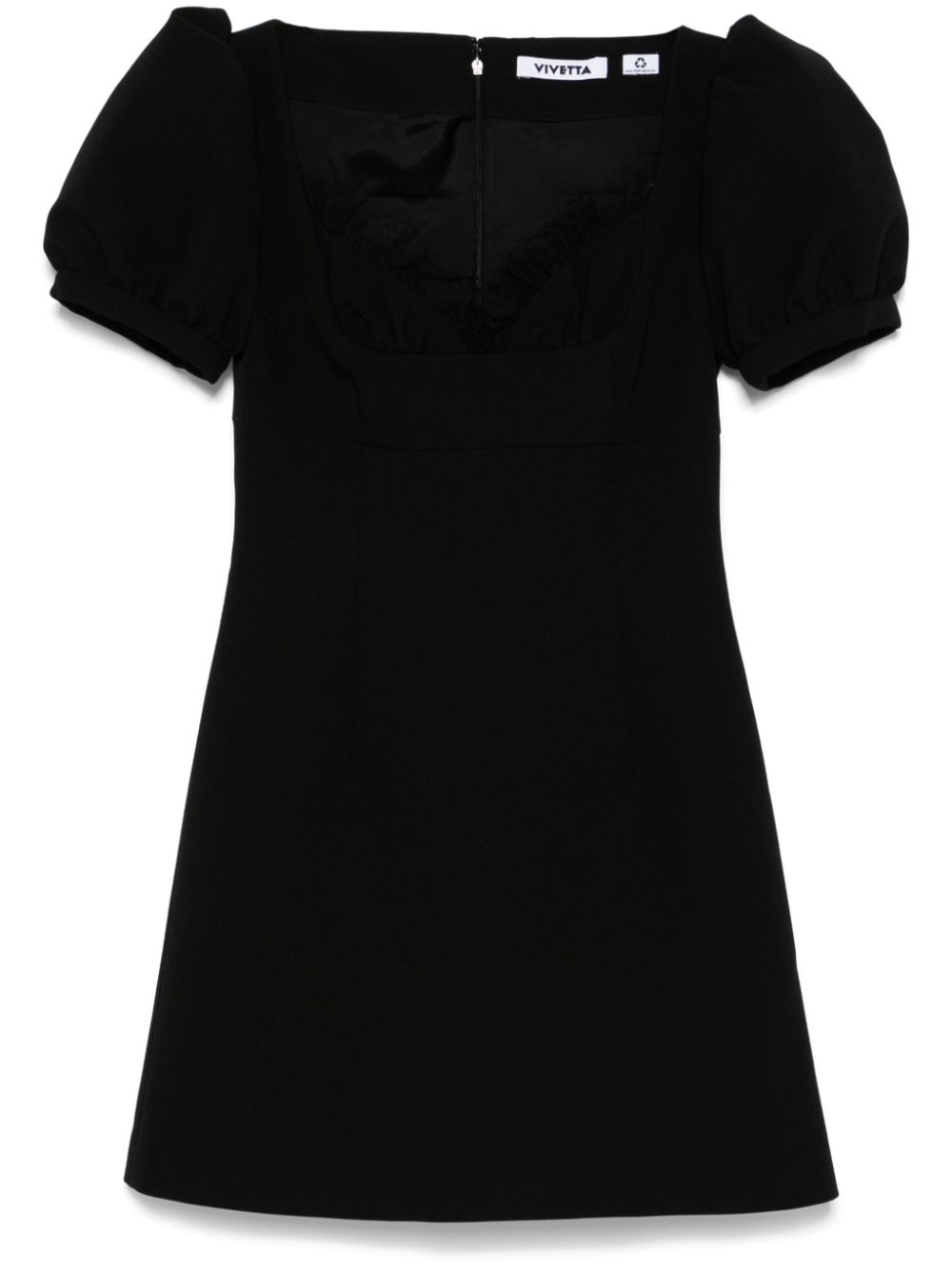 abito corto, maniche corte a sbuffo, chiusura posteriore con zip, scollo a cuore con bordo in pizzo, fondo svasato Composizione: 94% poliestere 6% elastane Istruzioni per il lavaggio: lavare a secco