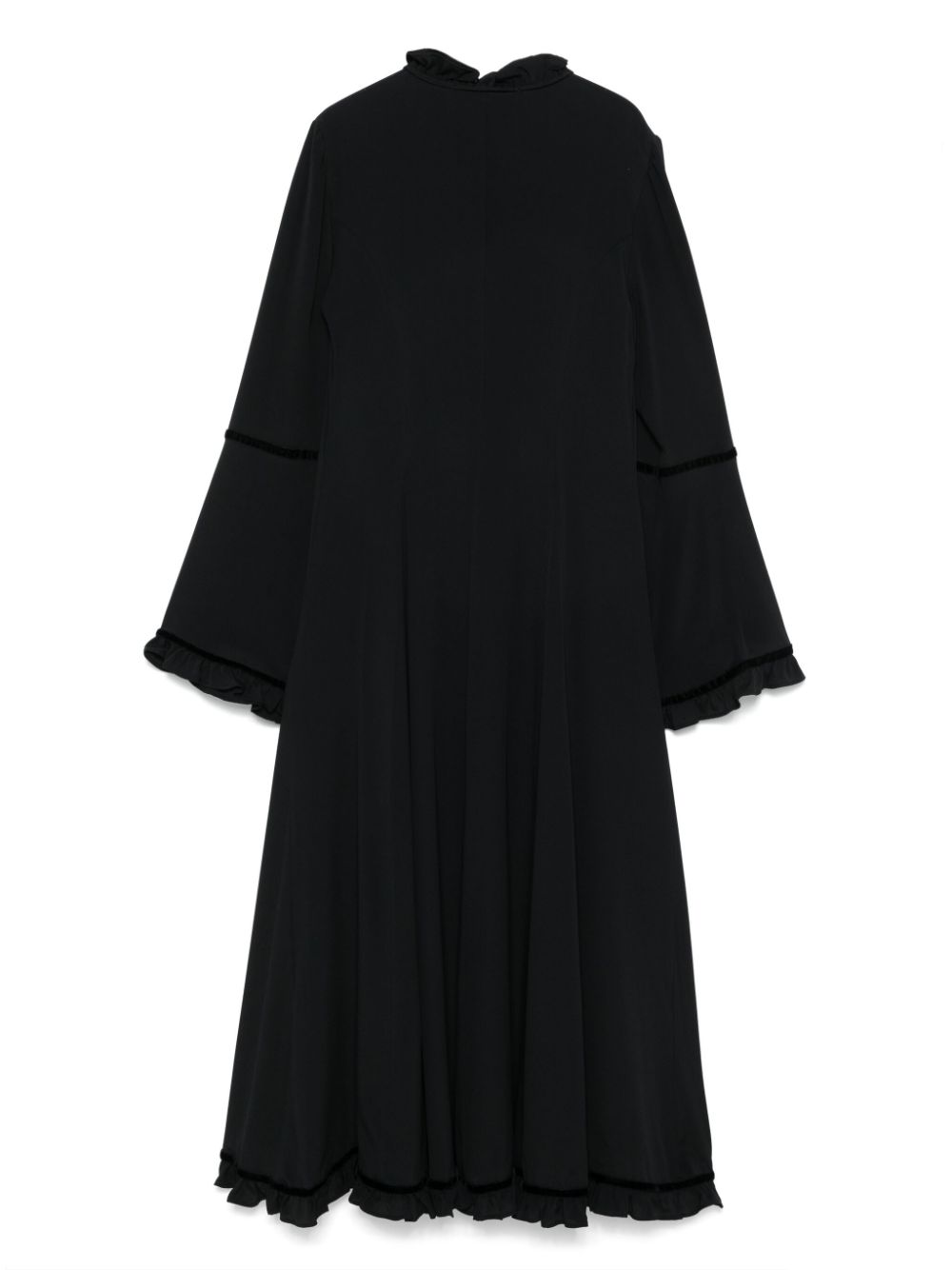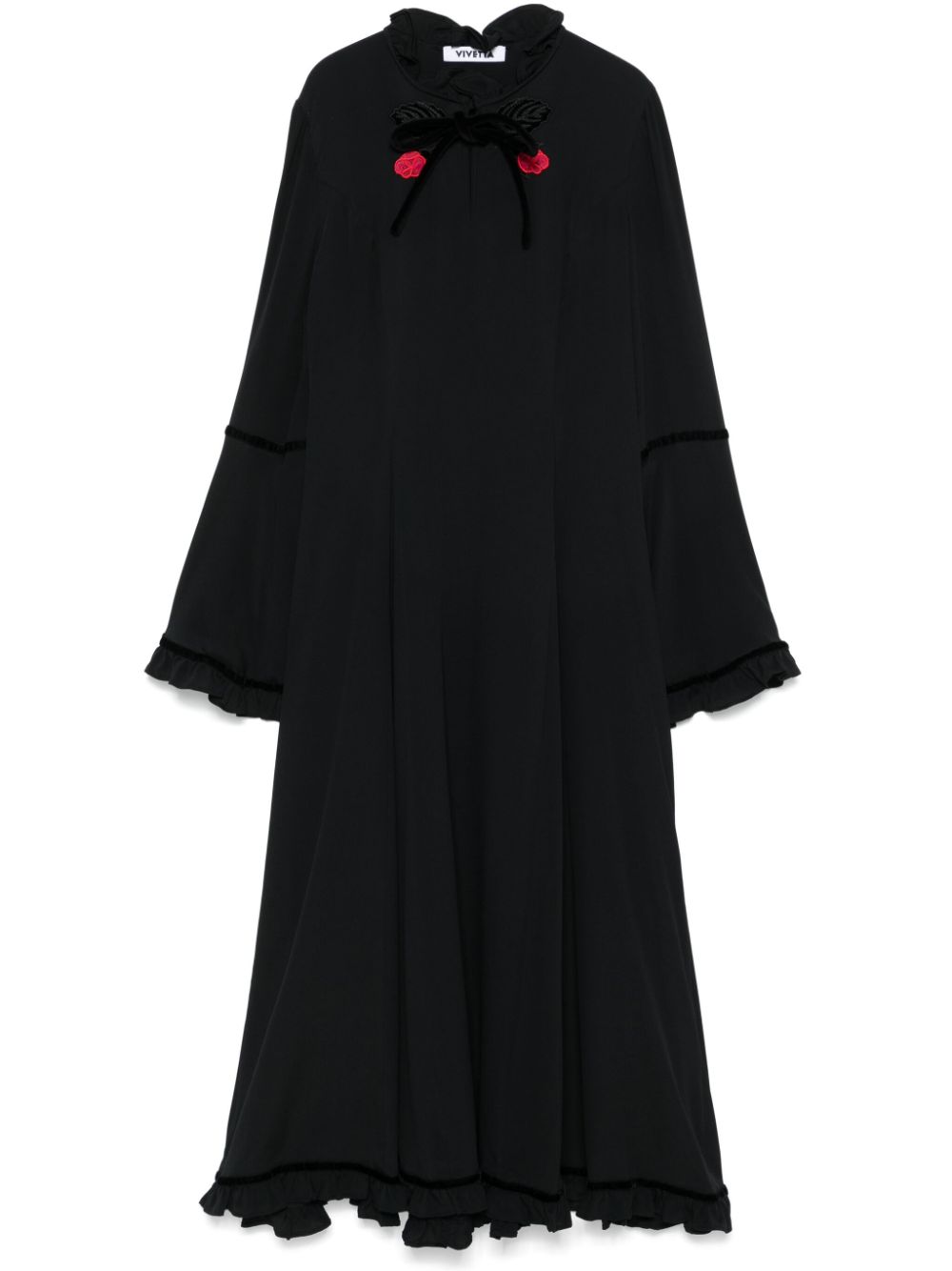 abito, crepe di chiffon, collo tondo con rouches, manica lunga svasata, chiusura con fiocco in velluto, rose ricamate a contrasto, fondo svasato, bordi con rouches composizione: 69% acetato 31% seta istruzioni per il lavaggio: lavare a mano